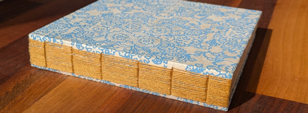 This workshop is aimed at beginners and those with experience of bookbinding who are not familiar with long stitch and its variants. All the variations on long stitch involve weaving the pages or sections into a cover which has slits across the spine. The book can be made with rigid or flexible covers. During the workshop, we will make a hard-covered version of long stitch. Afterwards, participants will know how to make both versions. The dense stitching requires the use of a soft paper, which workshop participants have to cut or tear to size manually. This process is quite time consuming but is necessary to achieve a book that celebrates the sewing, but also is more robust because the fore edge and spine have a roughly equal width. If you would like to make a version of long stitch with less dense sewing, please see the Long Stitch Variation page.