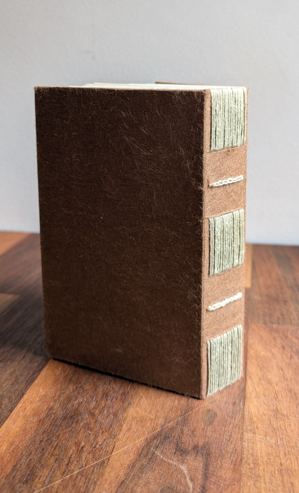 This workshop is aimed at beginners and those with experience of bookbinding who are not familiar with long stitch and chain and its variants. All the variations on long stitch involve weaving the pages or sections into a cover which has slits across the spine. The book can be made with rigid or flexible covers. During the workshop, we will make a hard-covered version of long stitch. Afterwards, participants will know how to make both versions. The dense stitching requires the use of a soft paper, which workshop participants have to cut or tear to size manually. This process is quite time consuming but is necessary to achieve a book that celebrates the sewing but also is more robust because the fore edge and spine have a roughly equal width. If you would like to make a version with less dense sewing, please see the Long Stitch Variation page.