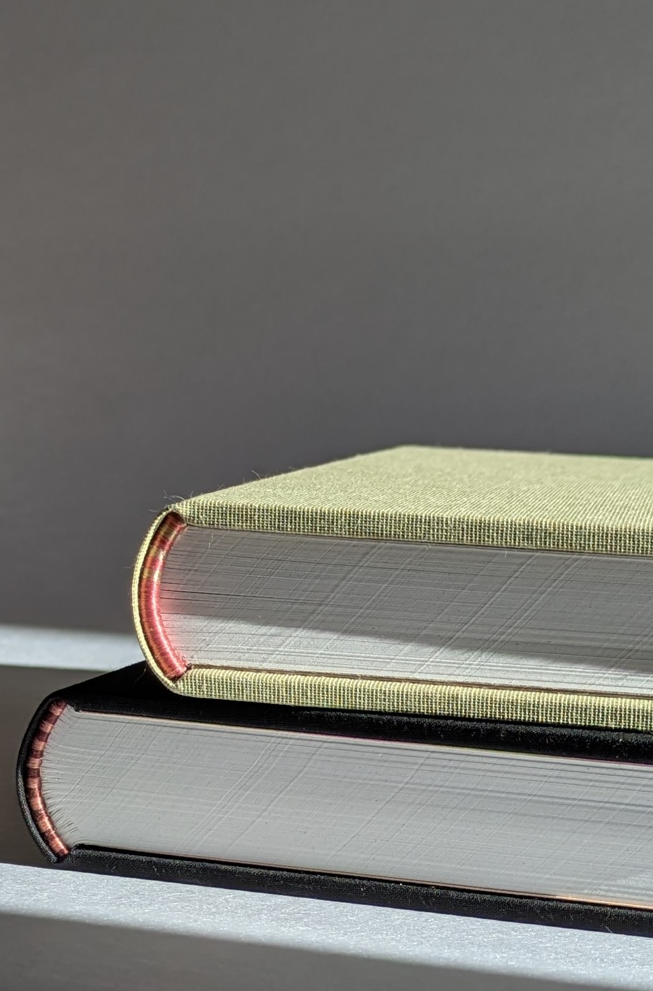 These books are more complicated than those made during our shorter workshops, however a beginner with good manual dexterity can produce this style of book. Rounding involves moulding the spine of a text block into an arc of approximately one-third of a circle, which in the process produces a concave fore edge. After a book is rounded it can be glued and lined to maintain its shape or it can be backed first. Backing involves manipulating the long edges of the rounded spine so that they form a ridge or shoulder on each side of the spine. As a result, if viewed from above, the shape of the spine resembles the cross section of a muffin or a mushroom. The processes help to make the book more robust and durable.